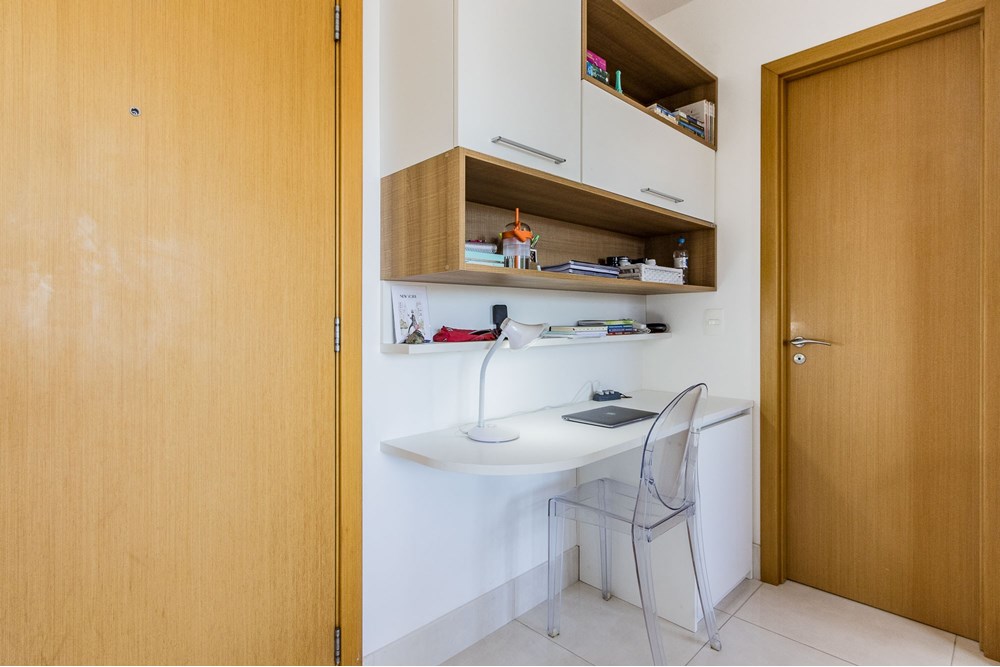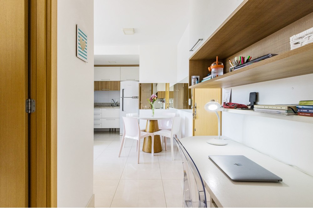Destaque para o home office projetado, que otimiza o espaço e oferece funcionalidade ideal para o dia a dia.