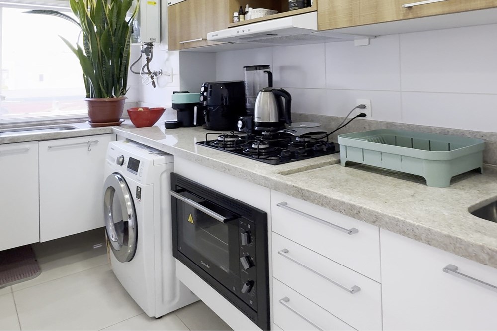 Ficam os móveis fixos planejados, proporcionando um ambiente moderno e bem aproveitado.