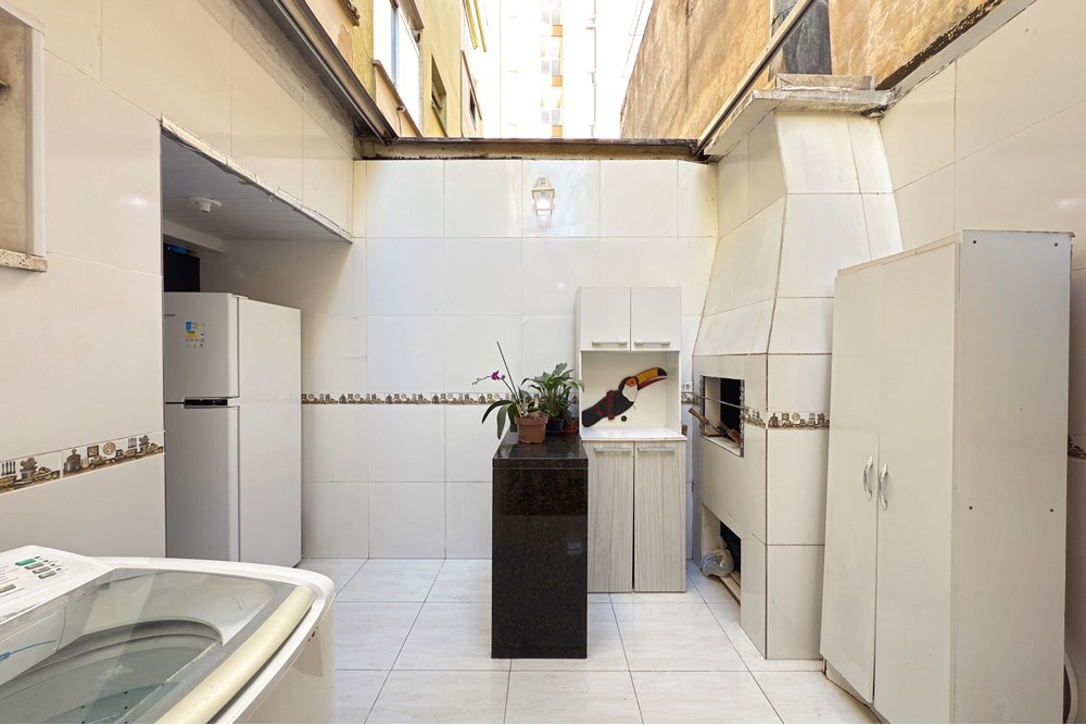 A cozinha funcional conecta-se ao espaço gourmet, espaço com churrasqueira e teto retrátil, perfeito para receber amigos e familiares, proporcionando momentos agradáveis tanto nos dias ensolarados quanto nas noites de confraternização.