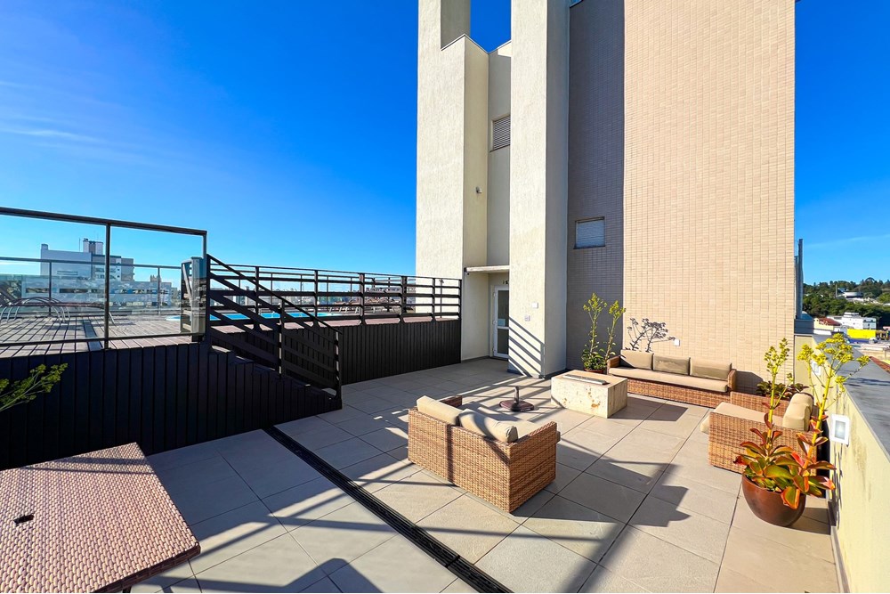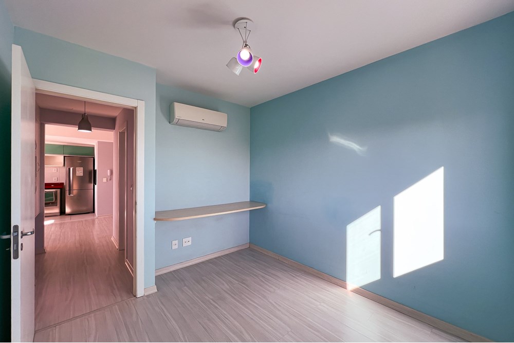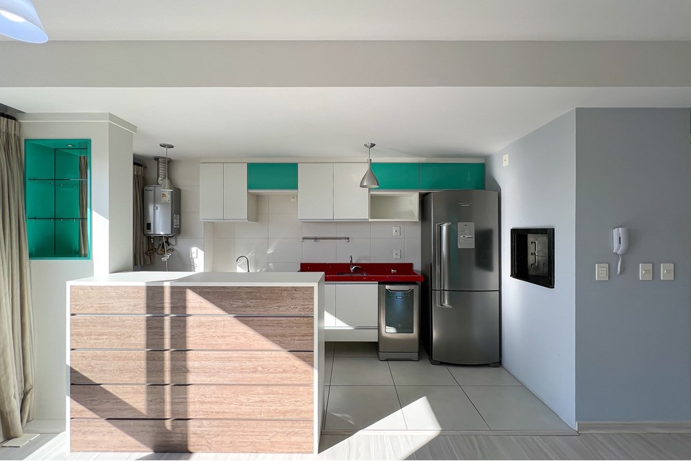 São 63 m² de área privativa muito bem distribuídos, com 2 dormitórios, sendo 1 suíte, living para dois ambientes, cozinha americana com churrasqueira integrada, banheiro social e área de serviço funcional e bem ventilada.