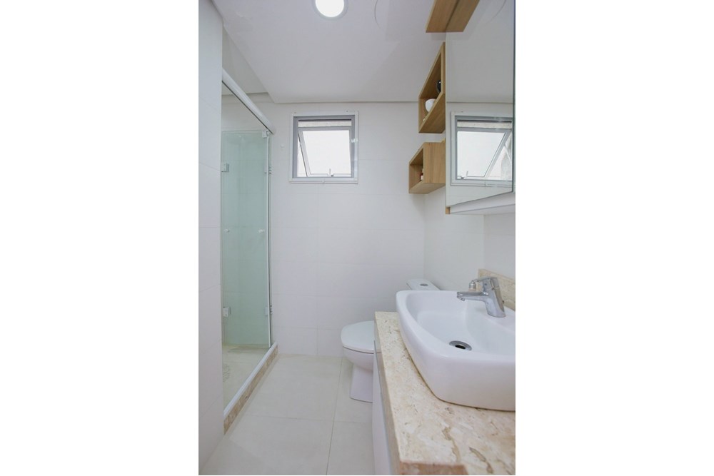 Banheiros com ventilação natural e balcões em mármore travertino;