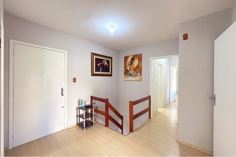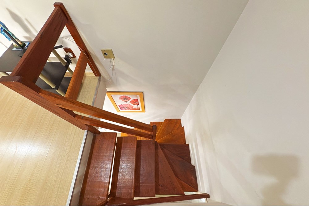 O acesso ao segundo andar é feito por uma escada de madeira confortável, que leva a dois dormitórios, um deles bastante amplo, com integração à sacada e espaço para um estar íntimo, além de dois banheiros. Este andar também conta com marcenaria sob medida.