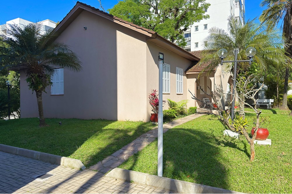 A casa, que a construtora optou por preservar, é onde fica o salão de festas, possui lareira e churrasqueira.