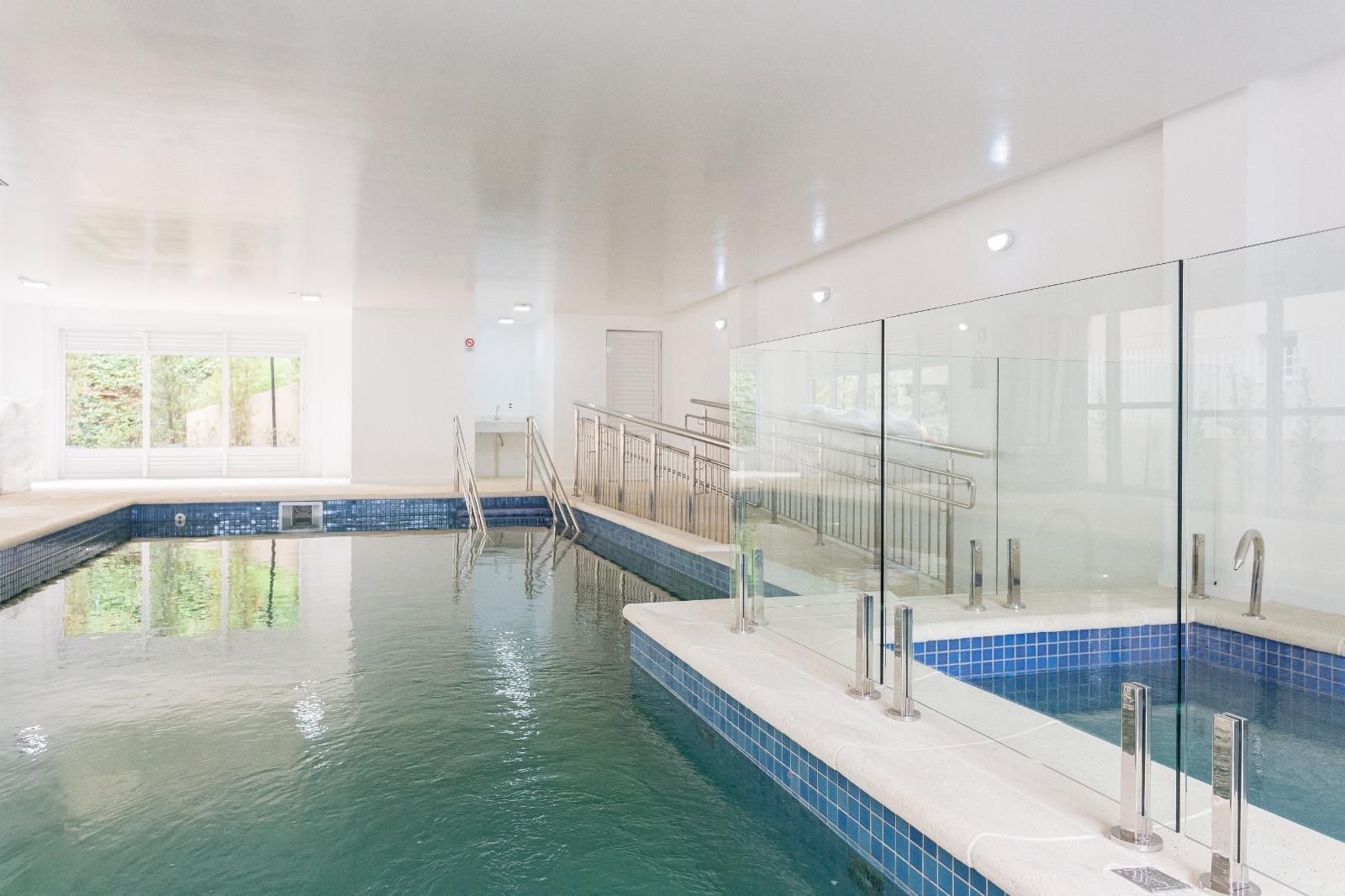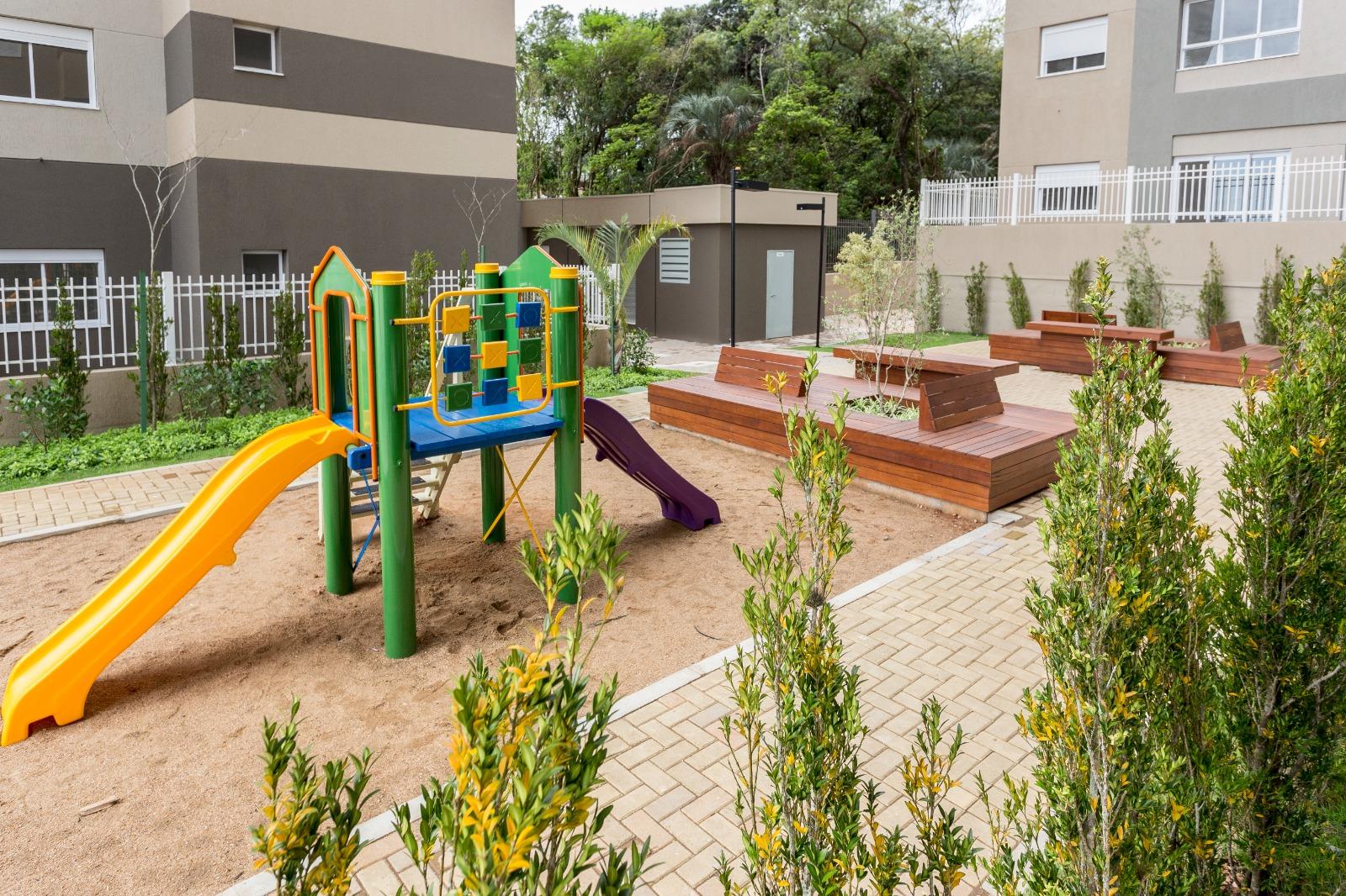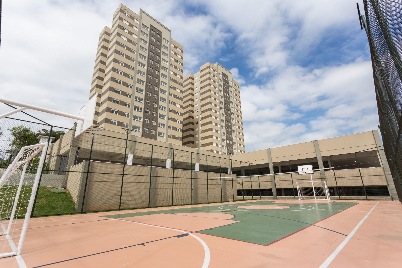 O condomínio oferece uma infraestrutura completa para toda a família: piscina coberta, academia, salão de festas adulto e infantil, espaço gourmet, quiosques com churrasqueira e forno de pizza, playground, quadra de esportes e portaria 24 horas.