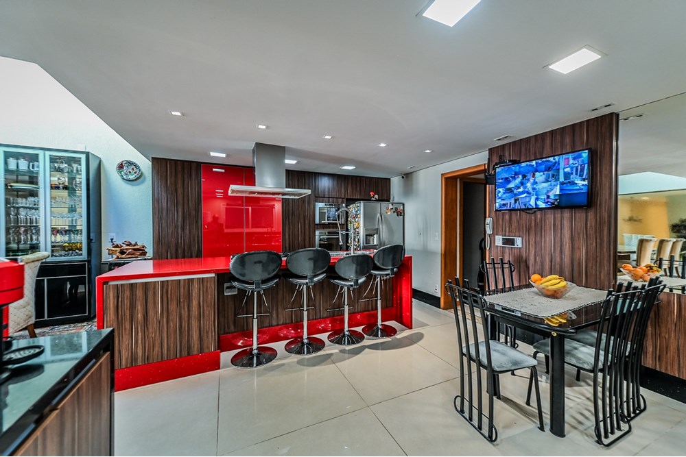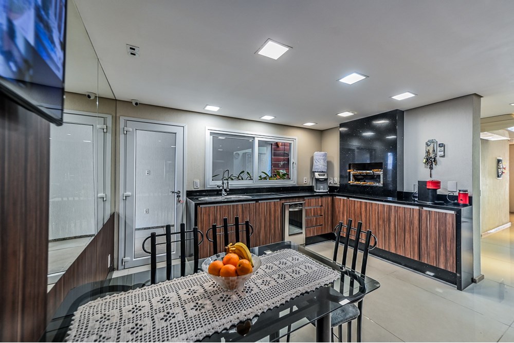A cozinha em silestone, equipada com ilha, fogão e armários planejados, é ideal para quem ama gastronomia. Um elevador interno leva ao andar das suítes, incluindo a master, com hidromassagem, closet e sacada privativa.