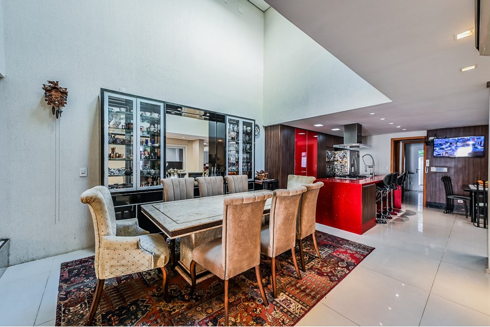 O living amplo com lareira, sacada espaçosa, cortinas automatizadas e projetor de vídeo oferecem um ambiente perfeito para relaxar e receber amigos. A sala de jantar com pé direito duplo e cortina dágua impressiona, enquanto o jardim de inverno traz serenidade ao lar.