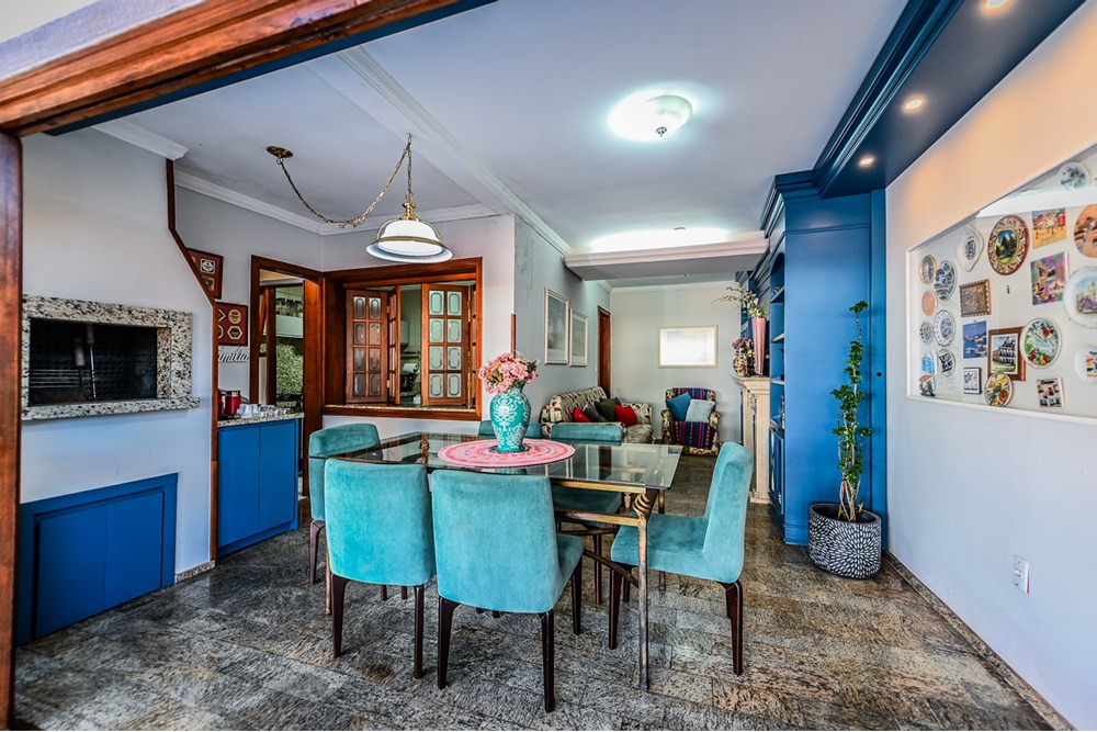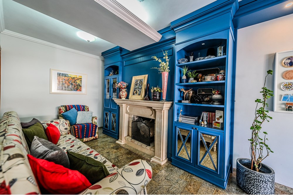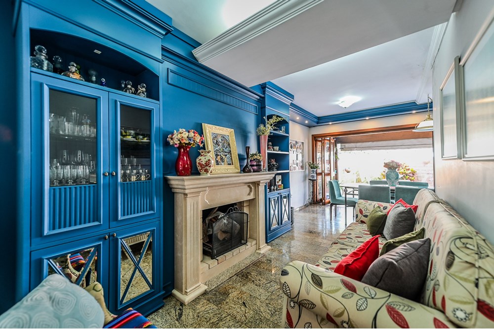 O living em L reúne conforto e praticidade: lareira em mármore Travertino, churrasqueira integrada à sala de refeições e passa-prato direto para a cozinha. A sala conta ainda com armários planejados da Mazzotti, de alto padrão, que trazem sofisticação ao ambiente.