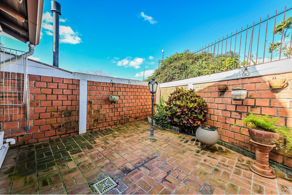 Varanda nos fundos com jardim, quintal revestido e espaço para horta