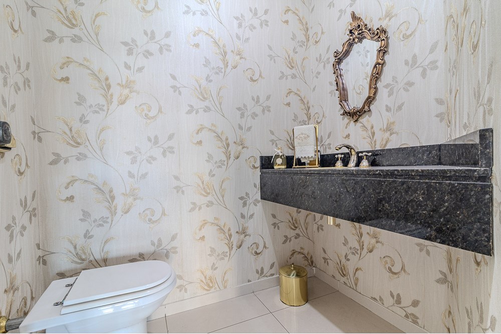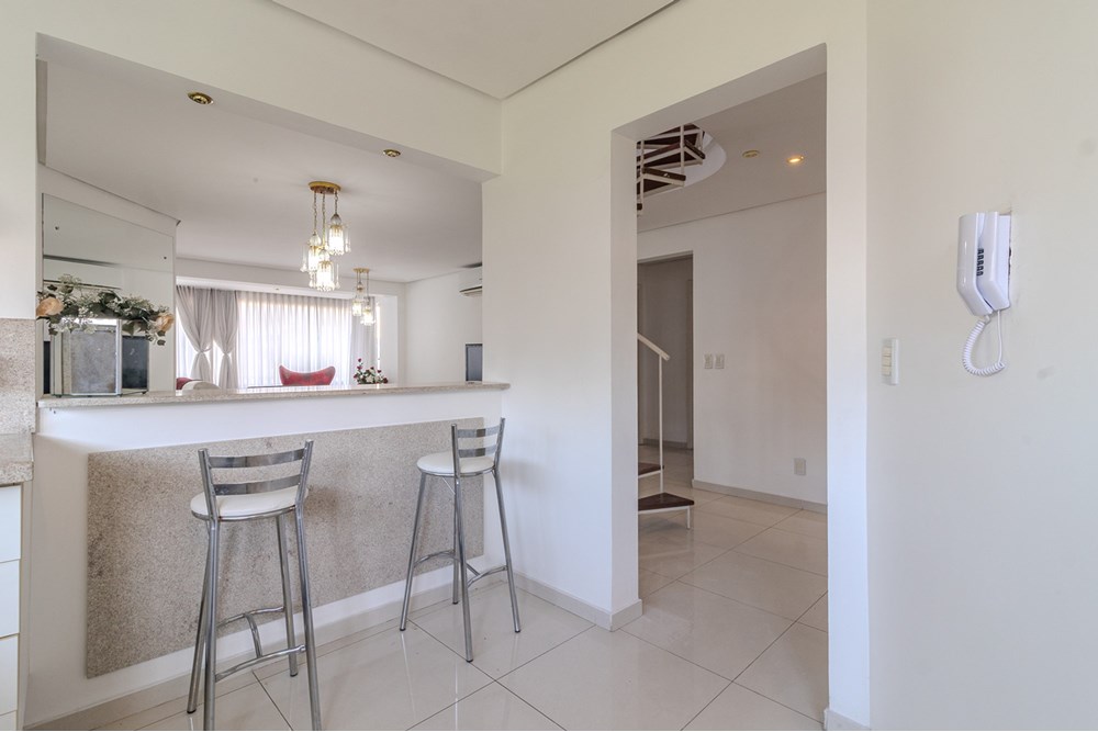 No pavimento inferior, living amplo para três ambientes integra-se à cozinha americana planejada em conceito aberto, contando ainda com lavabo e sistema de gás central. A área íntima dispõe de dois dormitórios bem iluminados e ventilados, atendidos por banheiro social, garantindo funcionalidade e conforto no dia a dia.