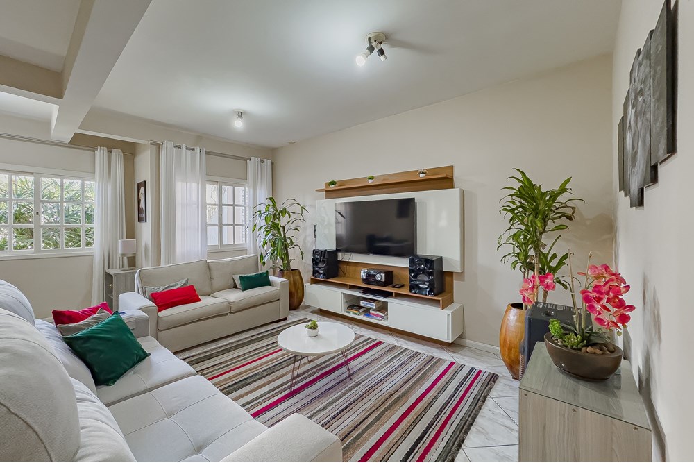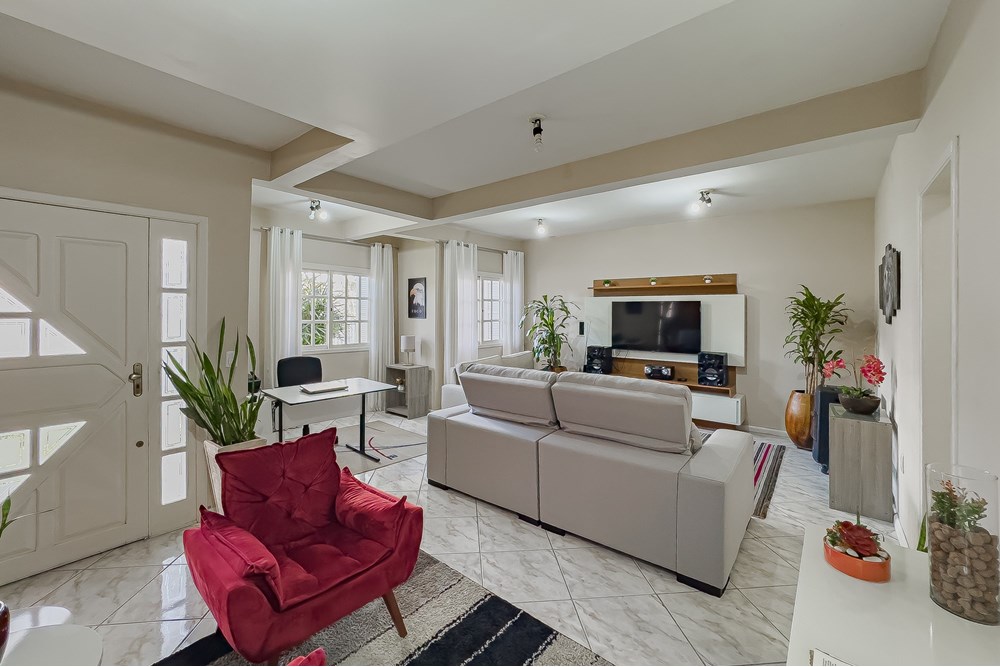 Logo na entrada, uma sala de estar ampla e iluminada, com espaço ideal para montar seu home office ou cantinho de leitura.