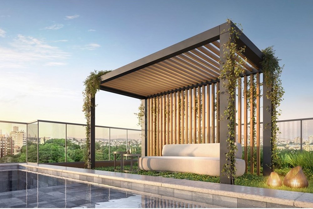 O rooftop é um verdadeiro refúgio urbano - lounge externo com paisagismo, salão de festas, espaço gourmet, pool house, piscina com deck molhado e o grande destaque: Skyglass Lounge - um mirante envidraçado em formato de cubo, com vista panorâmica para a cidade e o Parcão, criando uma verdadeira conexão entre arquitetura e natureza.